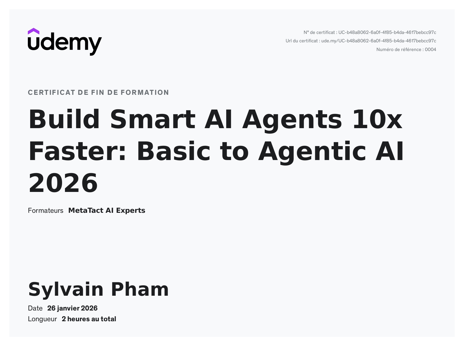 Formation Udemy sur la création d’agents IA avec Python. Je documente ici ce que j’ai appris en suivant le cours Build Smart AI Agents 10x Faster.