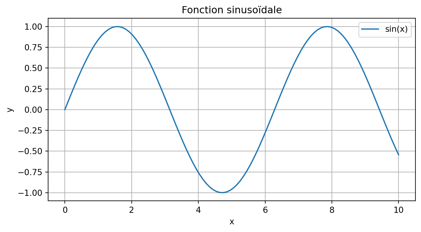 import numpy as npimport matplotlib.pyplot as plt# Générer des donnéesx = np.linspace(0, 10, 100)y = np.sin(x)# Créer le graphiqueplt.figure(figsize=(8, 4))plt.plot(x, y, label='sin(x)')plt.xlabel('x')plt.ylabel('y')plt.title('Fonction sinusoïdale')plt.legend()plt.grid(True)plt.show()