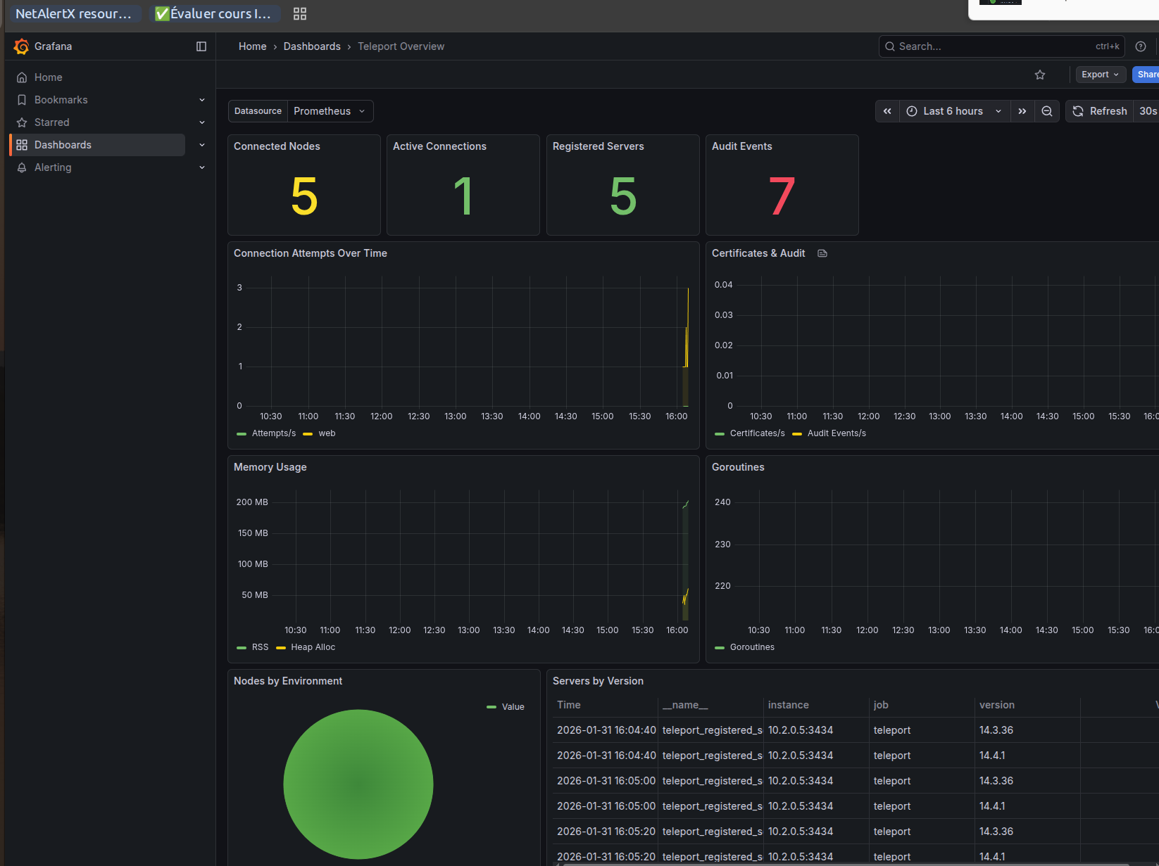 - targets: ['teleport:3434']Note : Teleport OSS expose des métriques différentes de la version Enterprise. Les métriques comme teleport_audit_events_total n’existent pas en OSS.